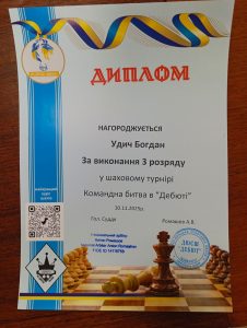 У наступні два дві 29 і 30 листопада в ШК ЛНУ та КЗ ДЮСШ “Дебют” (вул. Фредра 1) відбувалася “Командна битва в Дебюті”. Кожна команда складалася з трьох шахістів різної кваліфікації. На перших дошках змагалися другорозрядники, на других дошках третьорозрядники, на третіх дошках четверторозрядники. Загалом змагалися 22 команди. П’ять команд представляли наш ШК ЛНУ. Виступили наші команди гарно, три команди потрапили в першу десятку, проте командних нагород не здобули. Троє шахістів виконали чергові розряди. Аспірант філософського факультету Назарій Филик та студентка ФПМІ Аліна Мелешко подолали рубіж другого розряду. Студент хімічного факультету Богдан Удич виконав третій розряд. Побажаємо нашим шахістам успіхів у наступних змаганнях.